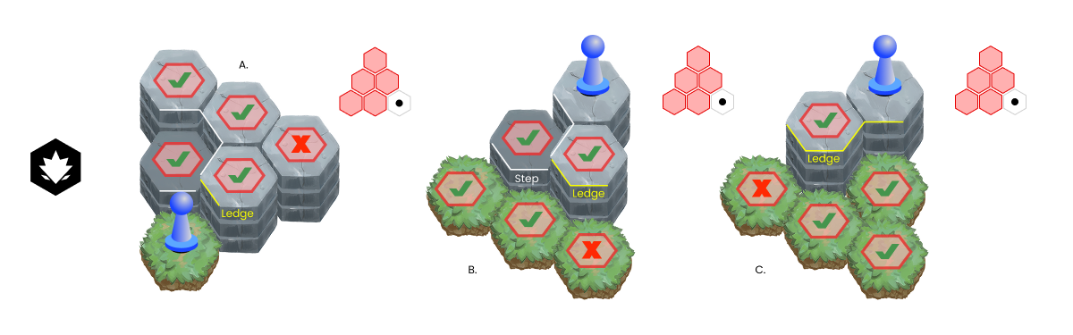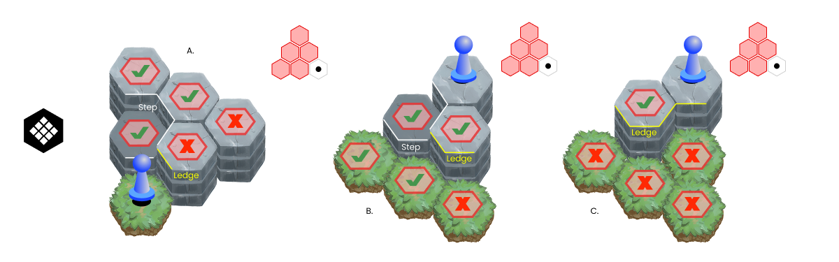 Movement: Players can legally move from their current tile to another open and adjacent tile with equal height -or- (1) height more -or- (1) height less than where the player is moving from.