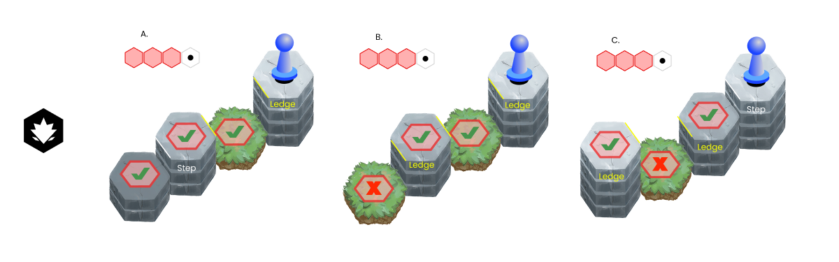 Example C: *Obstructions are terrain tiles with a height of at least (2) between the player and a target, preventing line of sight and attacks from reaching. Any tile edge that has a height difference of (2) or more, is considered a *ledge.