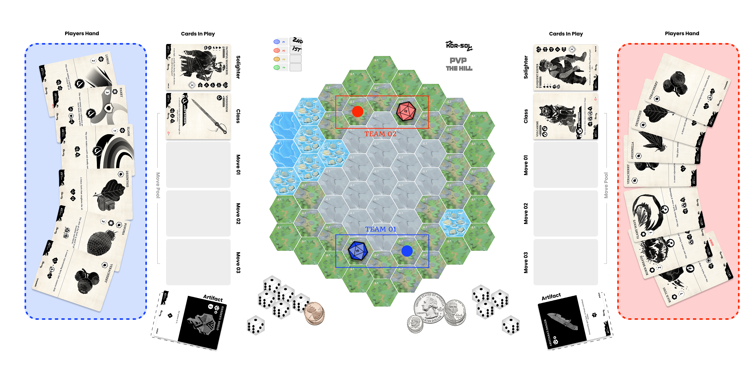 ARTIFACTS:Artifacts act like permanent items that can give the player unique abilities or enhance their Attributes or Traits during the game. Artifacts are placed face up on the table along with the Solighter and (Class) Solbound or Solbeast cards at the game start.